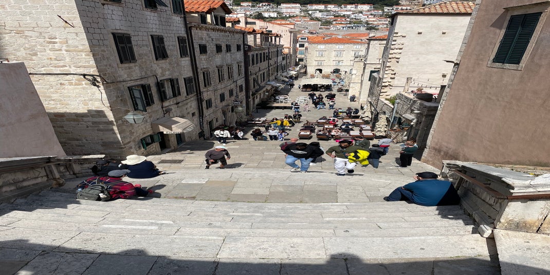 Am nächsten Tag geht es los mit dem Bus in die Altstadt. Es beginnt eine Art Zeitreise und Sportprogramm gleichzeitig. Dubrovnik ist trichterförmig in die Umgebung eingebettet. Das heißt Treppen hoch, Treppen runter, Treppen hoch usw. Wir einigen uns darauf den ersten Tag die Stadt auf der Stadtmauer zu umrunden. Am nächsten Tag erkunden wir das Fort und die Innenstadt.